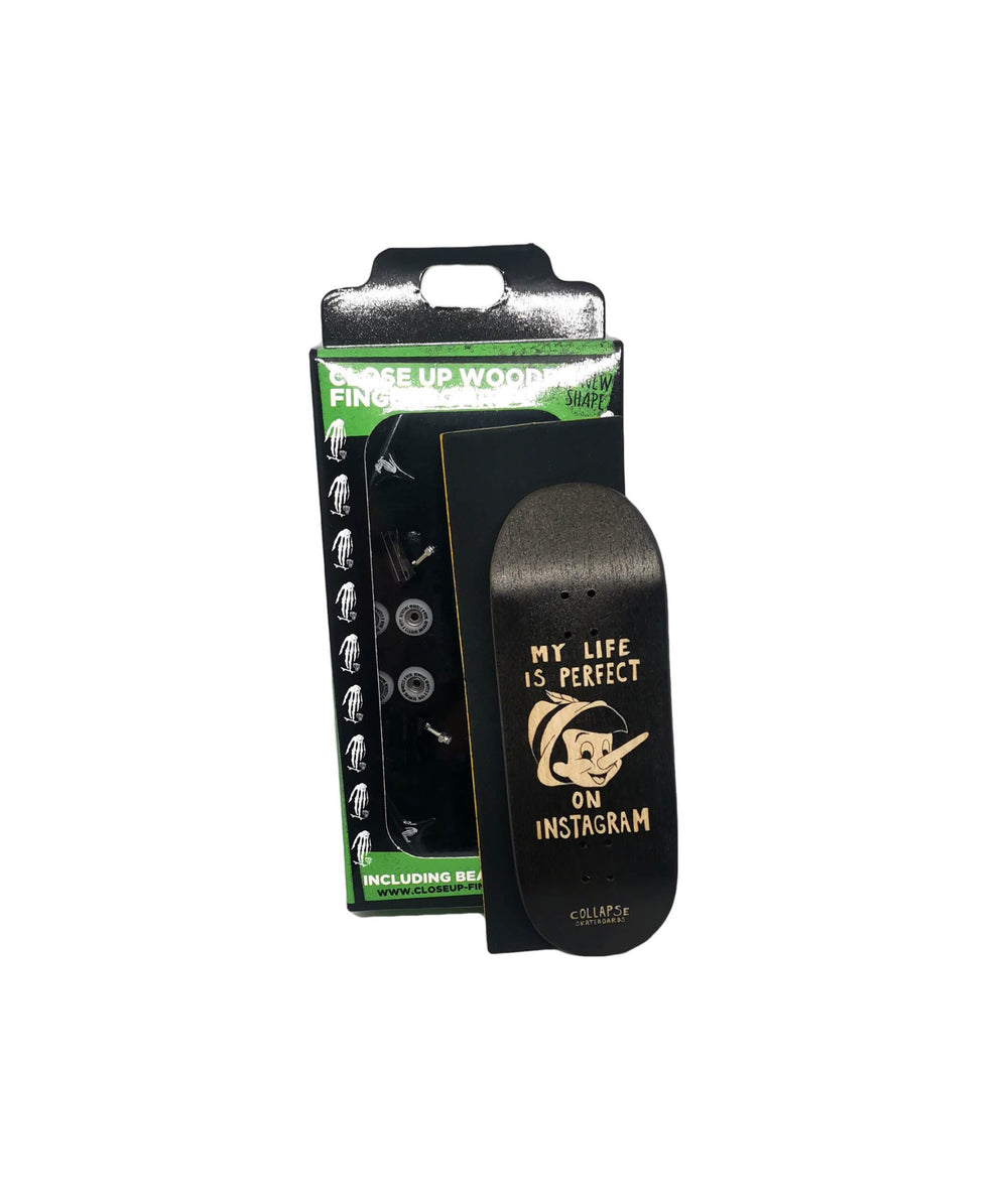 This Close Up Complete includes a maple deck with a Collapse Skateboards graphic, CNC printed bearing wheels, Close Up Logo V2 32mm Trucks, Fingerboard tool, lock nuts, screws, bushings, washers, tape all things necessary to assemble your own fingerboard.