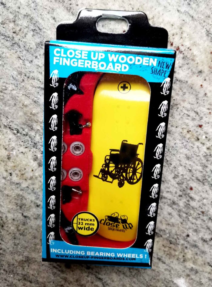 Close Up - Rolling Chair Graphic Complete Wooden Fingerboard with 32mm V2 Pro Trucks.
