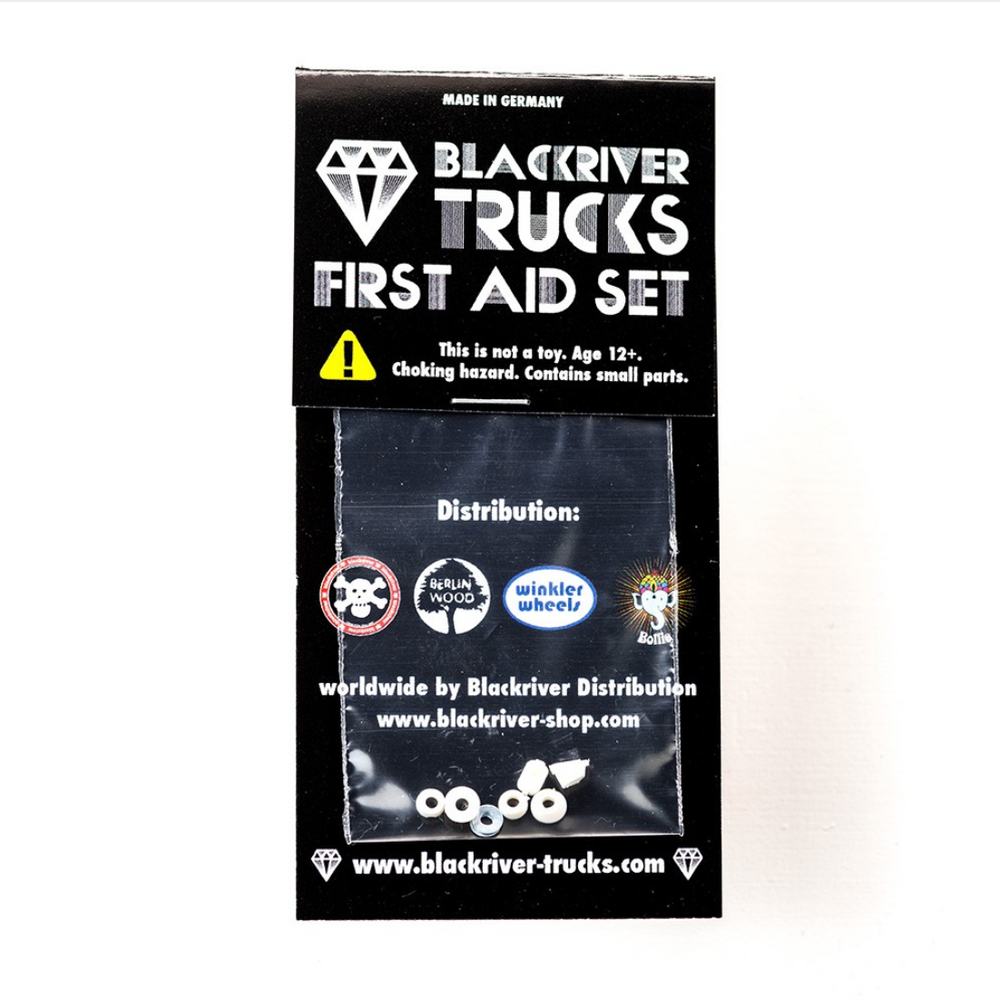 The Blackriver First Aid sets take care of your needs for spare parts and offer also some extras for your Blackriver Trucks. New bushings with a different hardness, new lock nuts or screws to replace lost ones or a new baseplate or hanger in a new color, the Blackriver First Aid Sets got it all.