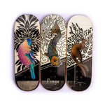 For the Finga Fingerboards 10 year anniversary, they present a vast range of improvements to their already widely popular fingerboard decks. Including new printing technology that reduces the weight of the board and allows for maximum pop. These boards have realistic wear graphic, which is lacquered, resistant but the graphic scrapes after some use to the bottom ply. Just like full-size skateboards.